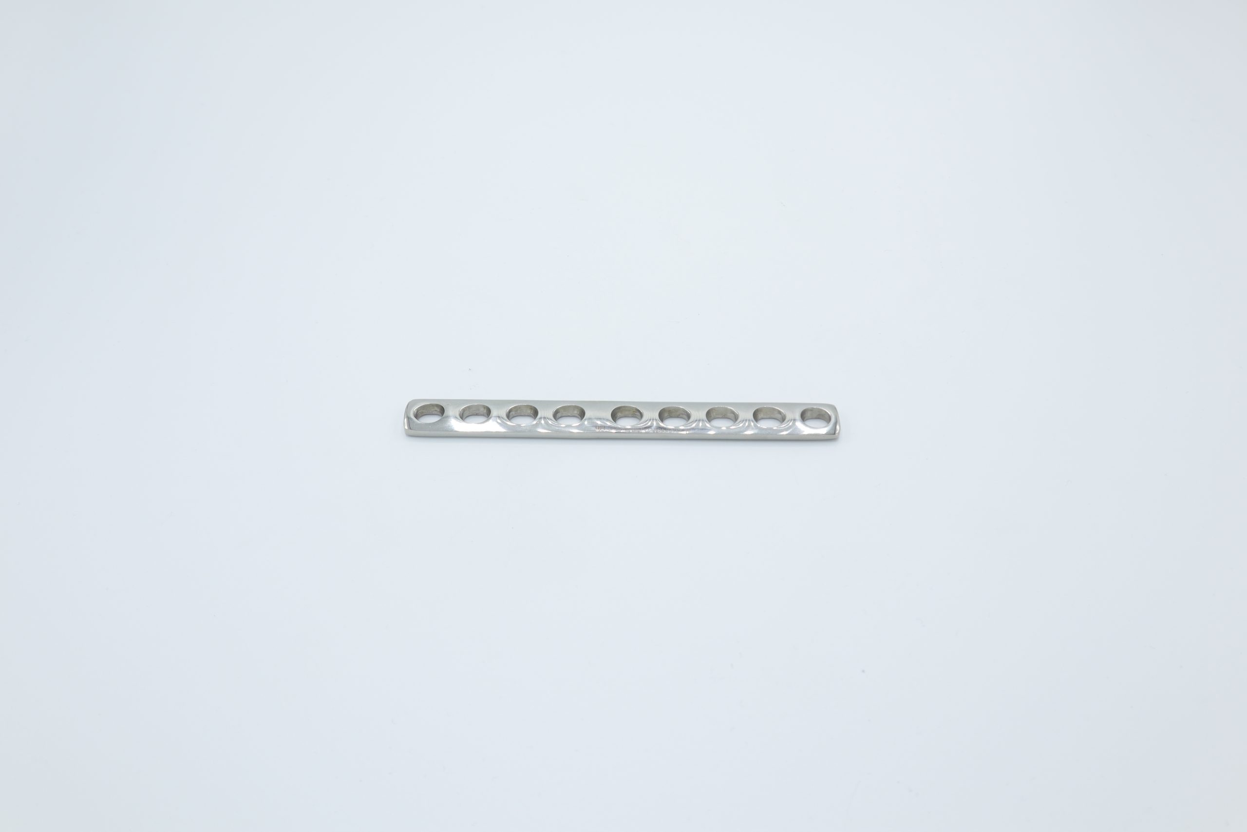 • ابعاد و طراحی: طول متناسب با 9 سوراخ (حدود 120-140 میلی‌متر بسته به مدل)، ضخامت 3.5 mm، با سوراخ‌های بیضی‌شکل برای فشرده‌سازی دینامیک (Dynamic Compression) و امکان خم‌کاری محدود برای تطبیق با آناتومی استخوان.